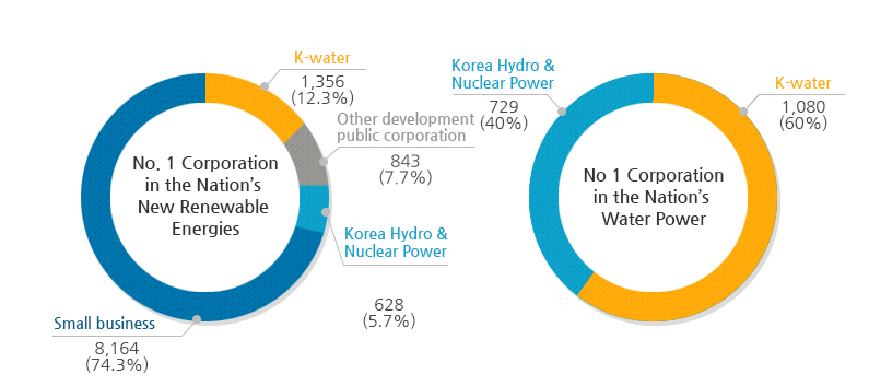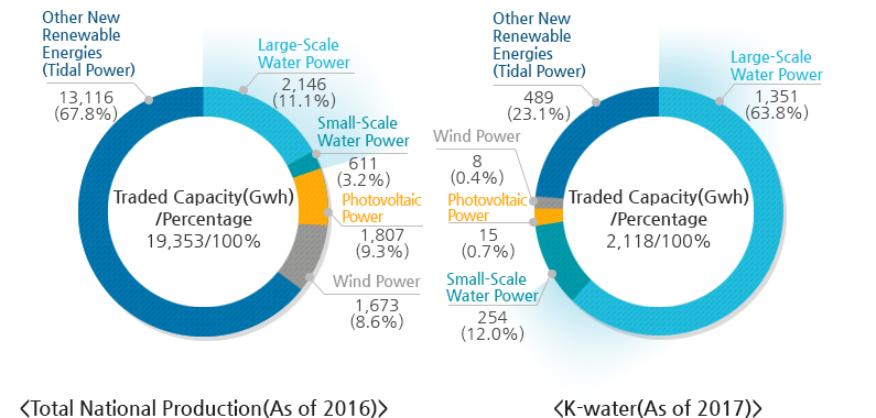 K-water produces 12.3% (1,356MW) of the nation'new renewable energies (10,991MW as of 2017) with its efforts starting in 1973 through Soyanggang Dam' water power, tidal power at Sihwaho Lake in 2011, and water power in 2012 through the Four River Project. In the case of water power, it produces 60% (1,080MW) of the nation' water power (1,809MW).