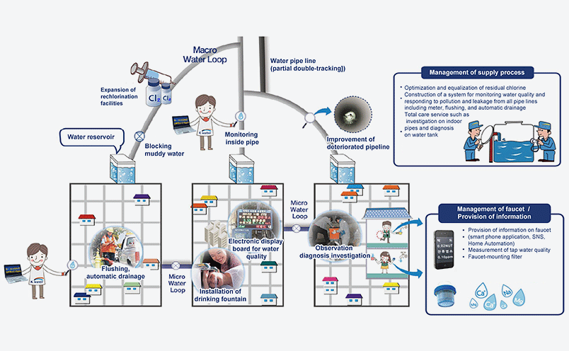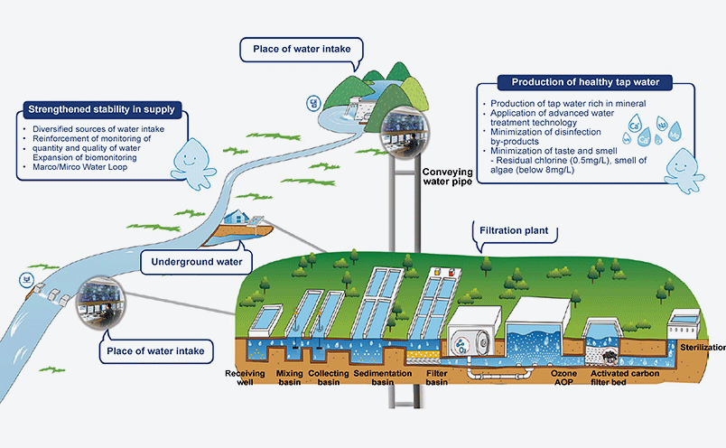 For stable securement of original water, we diversify water intake sources, reinforce management and supervision of quantity and quality of water, and produce tap water containing balanced mineral with minimized taste and smell from sterilization process.